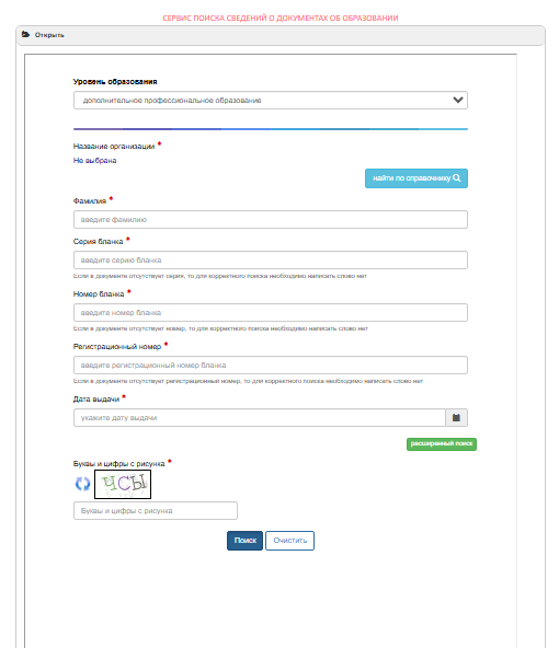 На странице практически в самом низу находится окно сервиса проверки документов об обучении (СЕРВИС ПОИСКА СВЕДЕНИЙ О ДОКУМЕНТАХ ОБ ОБРАЗОВАНИИ)